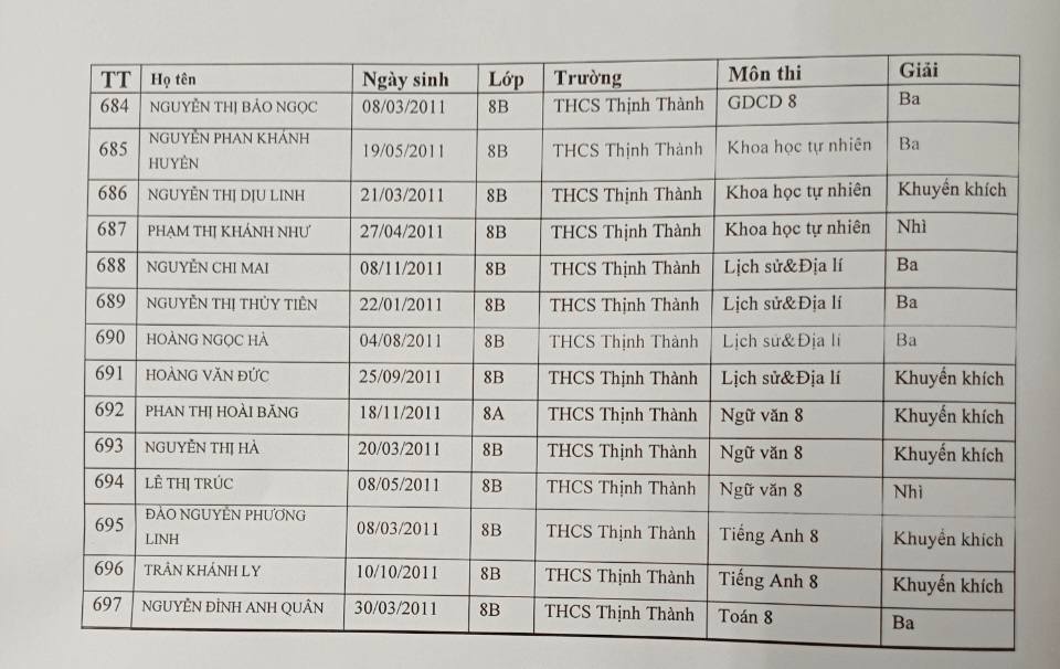 Trường THCS Thịnh Thành tự hào ghi dấu ấn “mốc son” trong kỳ thi học sinh giỏi khối 8 với những thành tích ấn tượng. Với sự chỉ đạo của ban giám hiệu nhà trường và tinh thần nỗ lực học tập không ngừng, với tổng số 18 em đi thi thì 14 học sinh xuất sắc đã mang về những giải thưởng danh giá ở nhiều môn thi như Ngữ văn, Toán, GDCD, Khoa học tự nhiên, Lịch sử & Địa lí, Tiếng Anh. Trong đó có 5 môn đậu 100% như Ngữ Văn, Tiếng Anh, Lịch sử địa lý, KHTN và 2 giải Nhì, 5 giải Ba và 7 giải Khuyến khích – minh chứng cho sự đầu tư chất lượng trong giảng dạy và sự chăm chỉ của học sinh. Những gương mặt tiêu biểu như Phạm Thị Khánh Như (giải Nhì môn Khoa học tự nhiên), Lê Thị Trúc (giải Nhì môn Ngữ văn), cùng nhiều em khác đã góp phần làm rạng danh nhà trường. Đây là động lực để thầy trò THCS Thịnh Thành tiếp tục phấn đấu, chinh phục những đỉnh cao mới trong học tập.